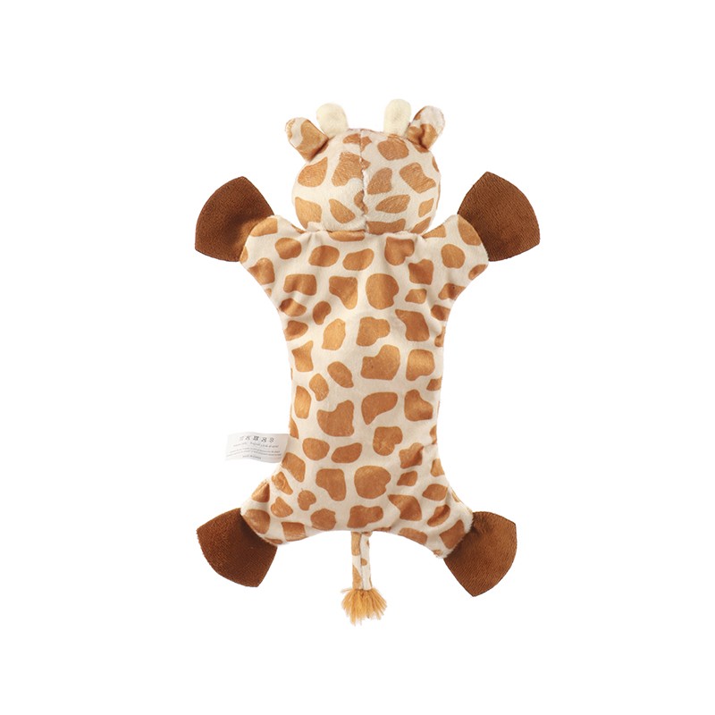 Zabawka posiada wypełnienie z szeleszczącego materiału oraz piszczałkę.