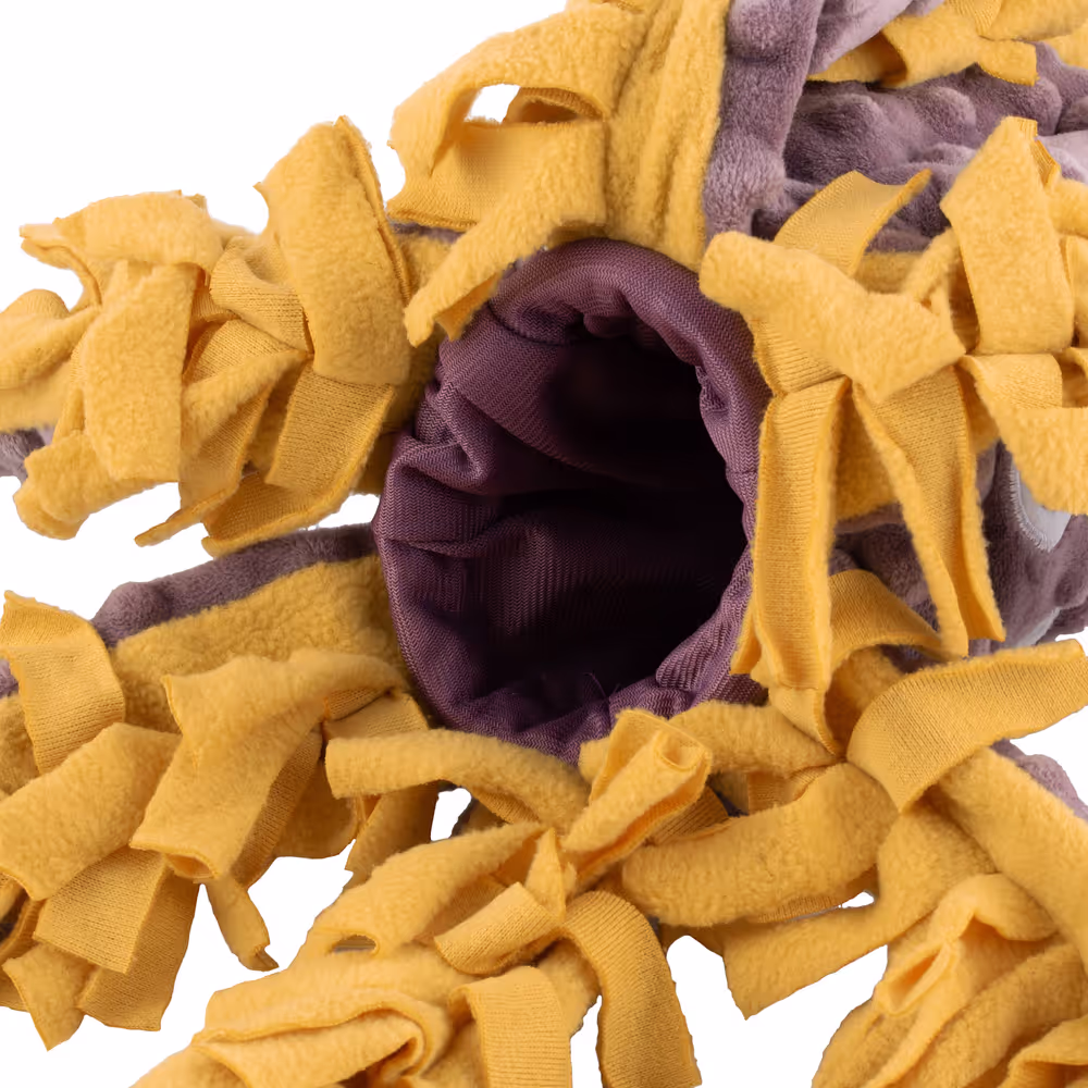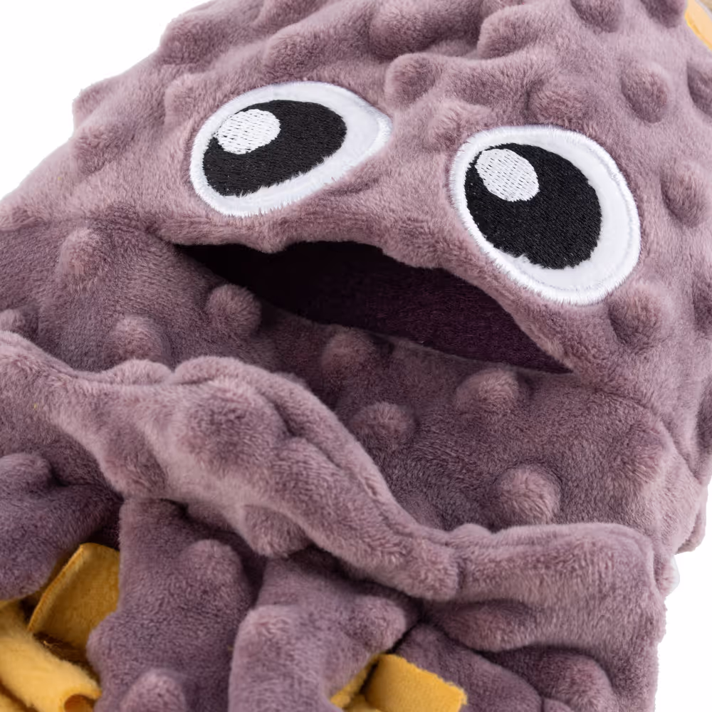 Jeśli Twój czworonożny przyjaciel zbyt zachłannie pożera smakołyki, to ta ośmiorniczka wydłuży czas spożywania przysmaków i urozmaici psie życie. Paseczki na sześciu mackach zostały wykonane z miękkiego i przyjemnego w dotyku polaru, zachęcają do tarmoszenia i noszenia w pyszczku. We wnętrzu głowy możesz ukryć naprawdę sporo przysmaków, albo jeden duży. Dzięki szerokiemu otworowi, dostęp do schowka jest łatwy co nie zniechęci szczeniaka, który dopiero uczy się funkcji zabawek węchowych. Przysmaki zapachem zachęcają do poszukiwania, uczą psiaka koncentracji i skupienia. Dla bardziej zaawansowanych węszycieli w zabawce jest jeszcze jedna, mniejsza kieszonka – pod oczami ośmiornicy. Dla dodatkowej atrakcji i utrzymania uwagi cała głowa zabawki szeleści. Ośmiornicę możesz wyprać w pralce (w 30°C), co znacznie ułatwia utrzymanie w czystości.